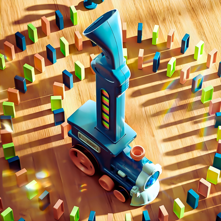 רכבת חשמלית שמניחה אבני דומינו בצבעים מרהיבים, במרווח אחיד של כ־1.5 ס״מ.