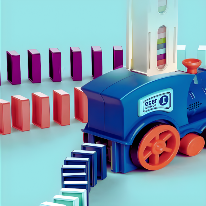 הרכבת החשמלית מניחה את אבני הדומינו אחת אחרי השנייה בצורה מדויקת ומסודרת, בלחיצה אחת בלבד.